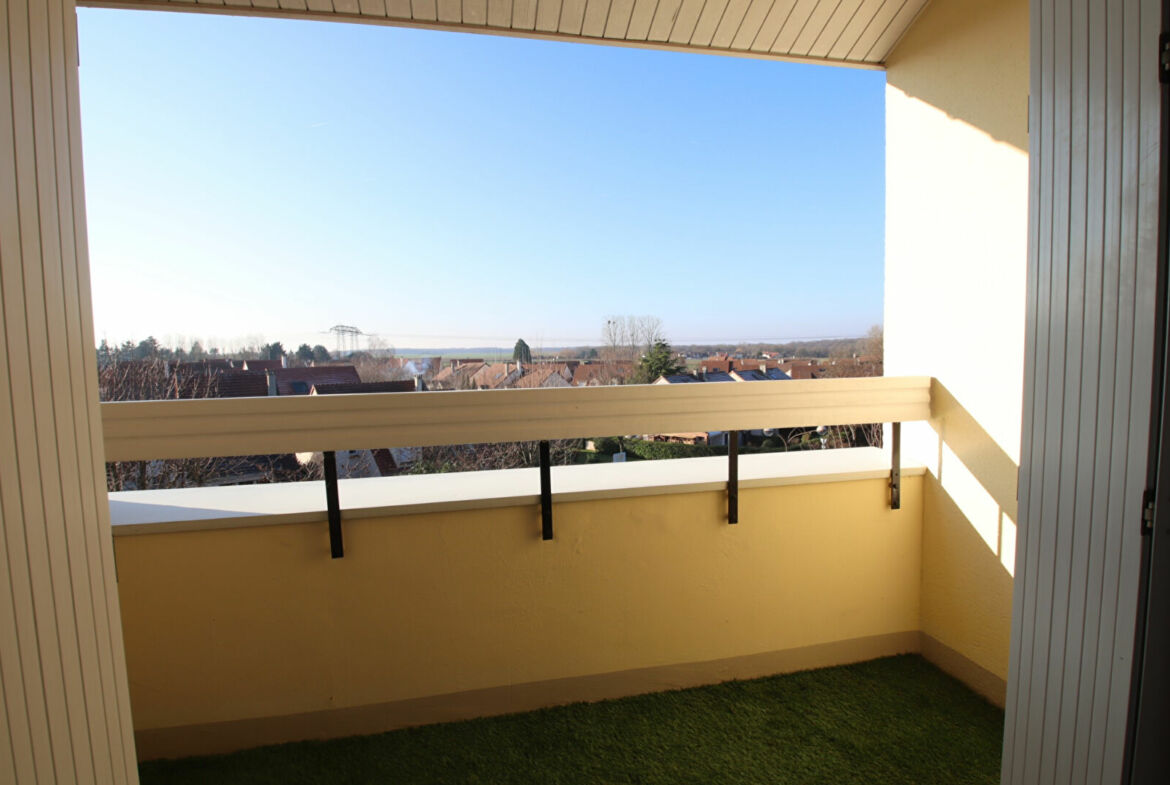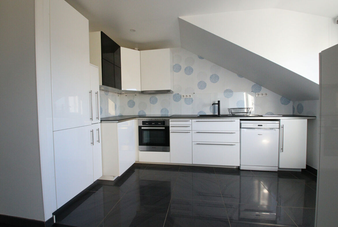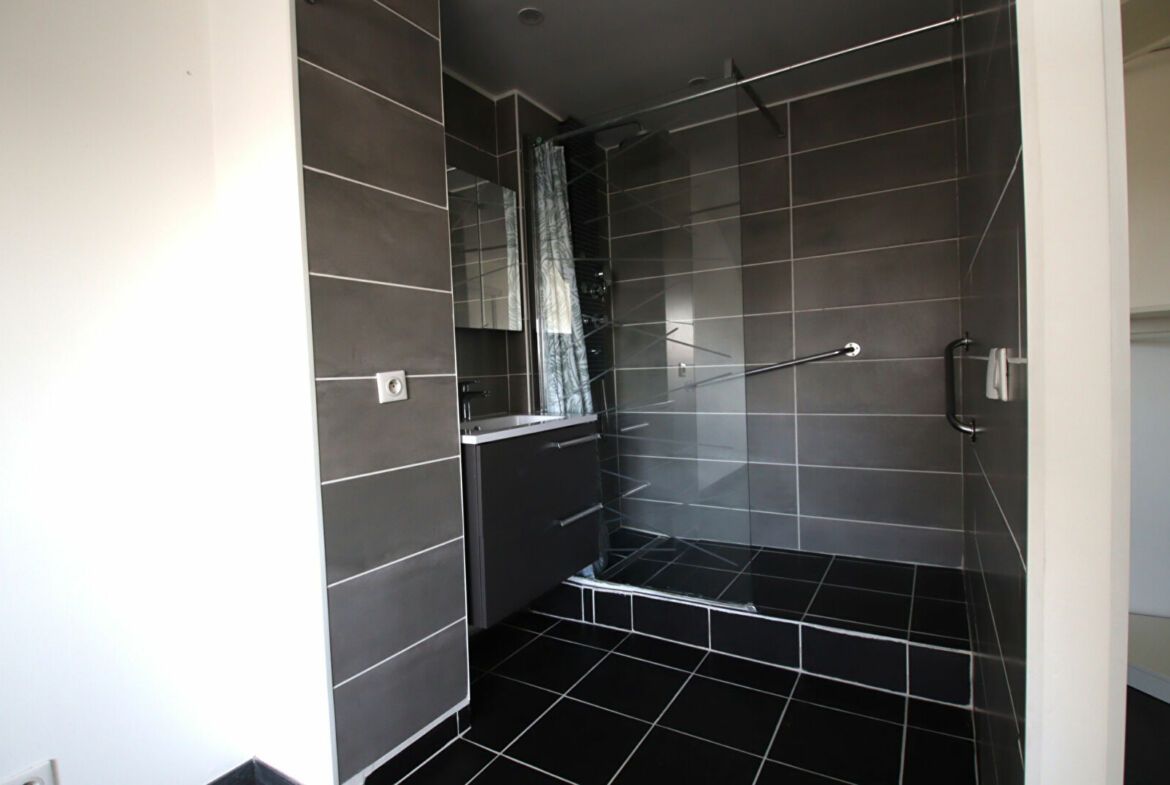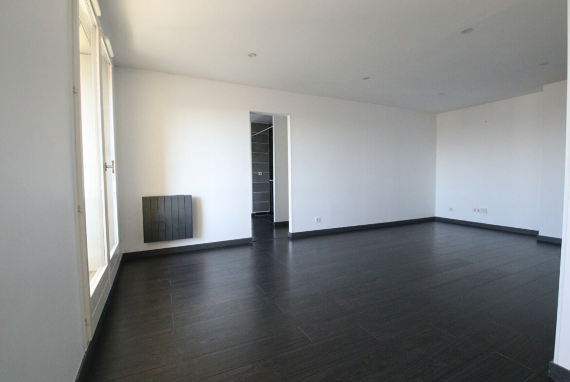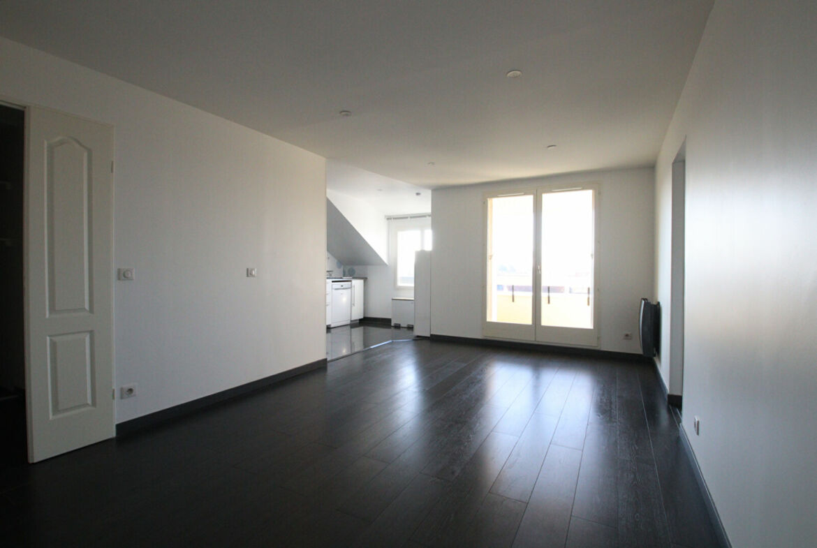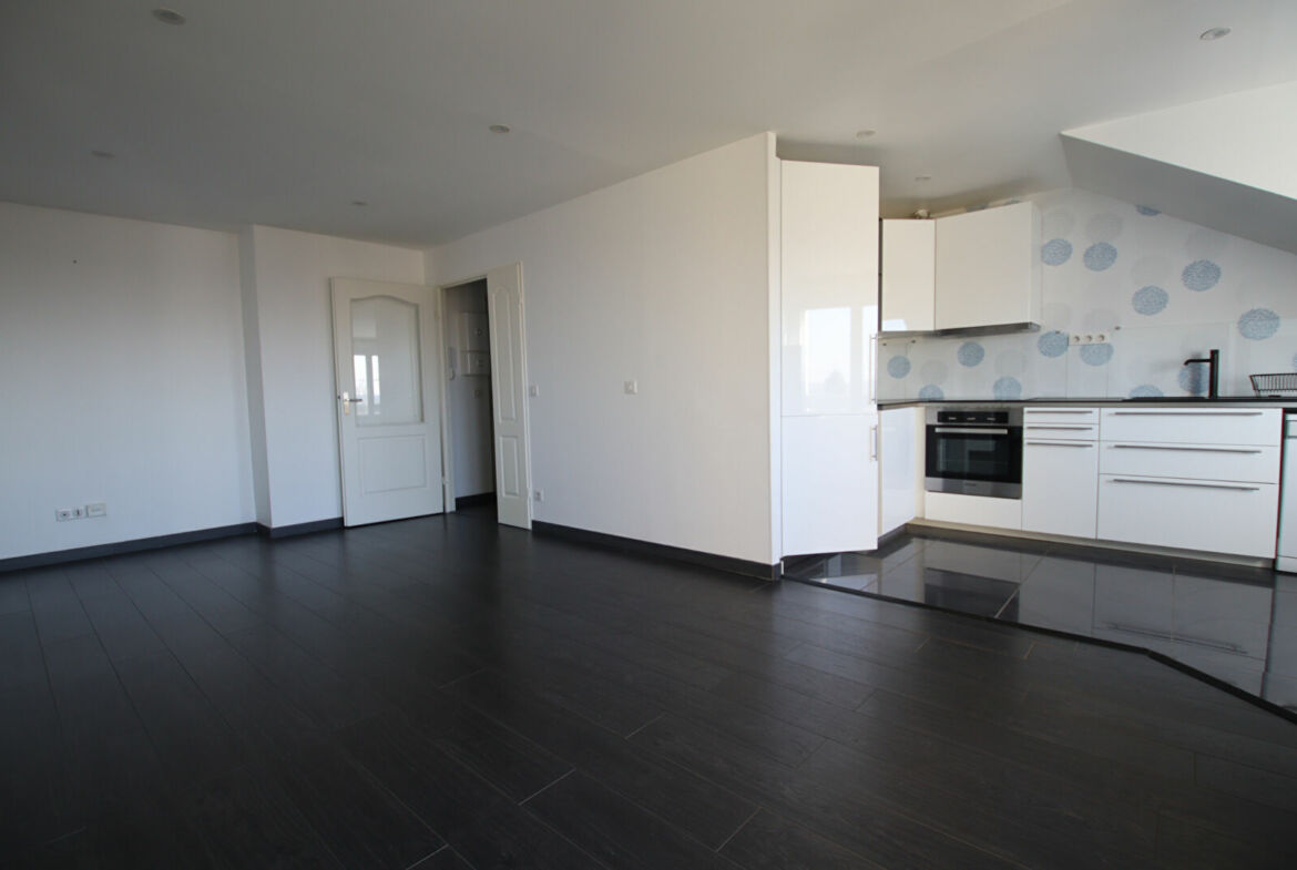 Appartement de 2 pièces, 3ème et dernier étage avec ascenseur, 48 m² habitables, entrée, salon avec balcon (ouest), cuisine ouverte et équipée, salle d’eau, chambre, cave et une place de parking au sous-sol.