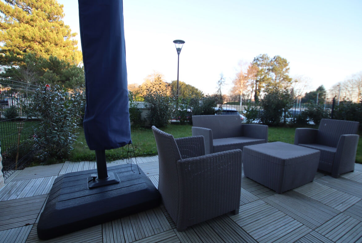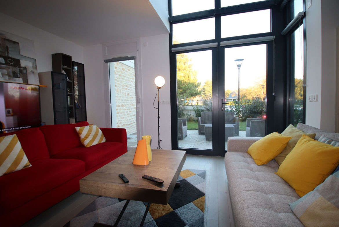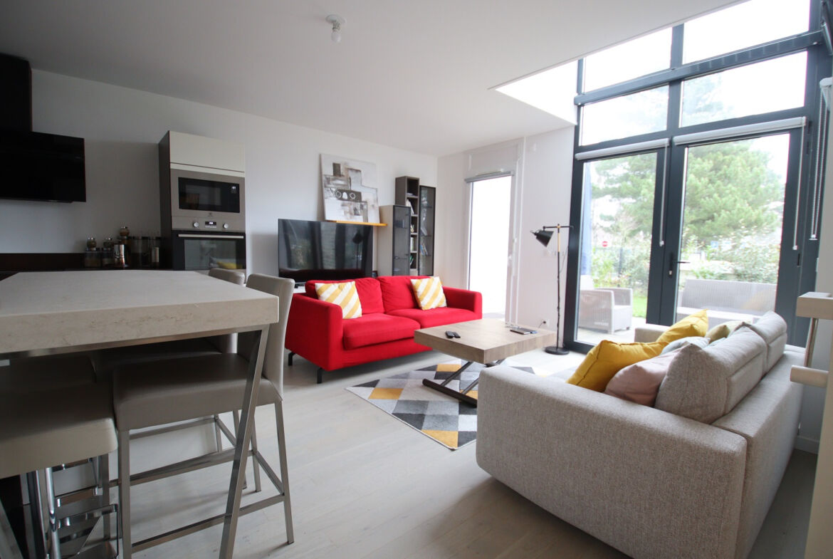 Appartement de type F3, résidence 2020 Kaufman et Broad, lumineux en duplex en parfait état , 72 m² habitables, terrasse avec jardin 55 m², entrée, salon cathédrale (Est), cuisine ouverte et équipée, rangement et salle d’eau avec wc.