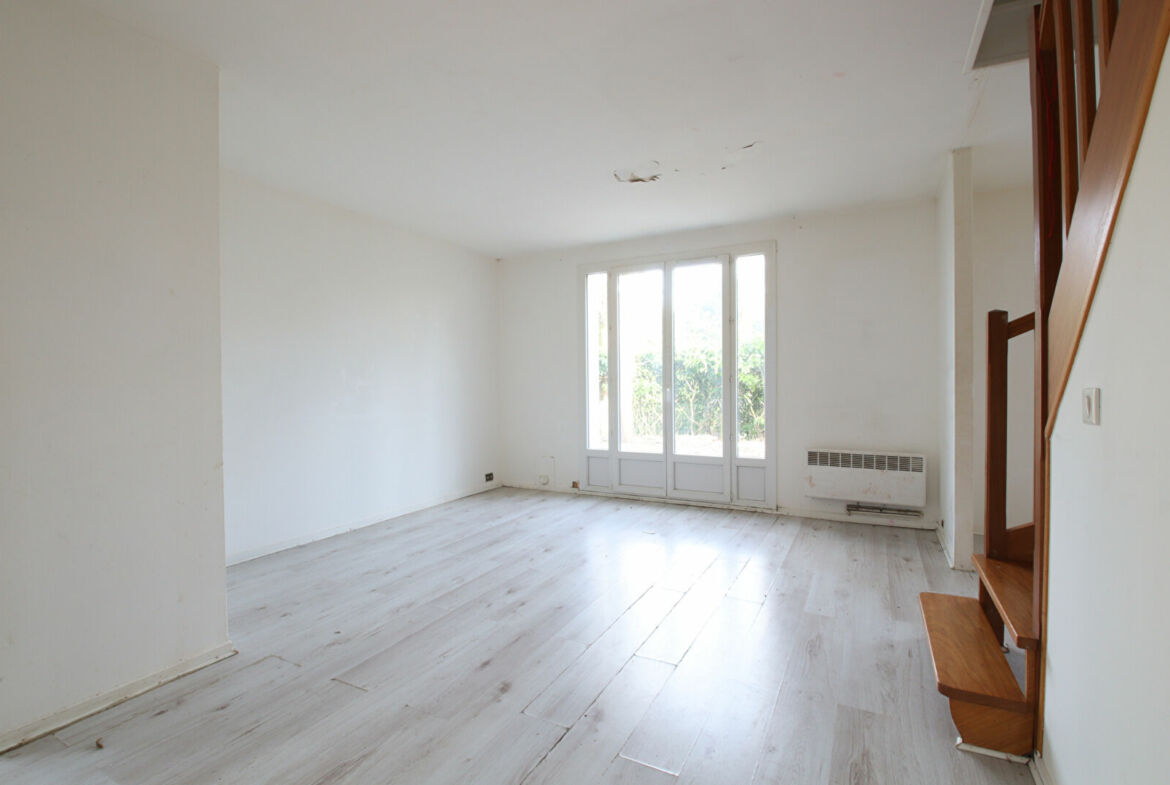 Maison de 5 pièces, 90 m² habitables, terrain 370 m², comprenant : entrée, salon, coin repas, cuisine, deux chambres, salle de bain, wc et buanderie/cellier.
