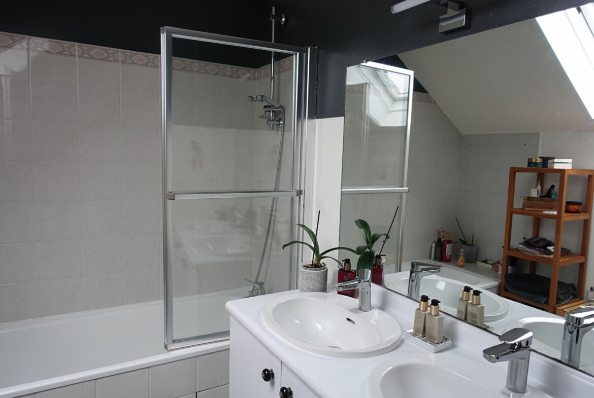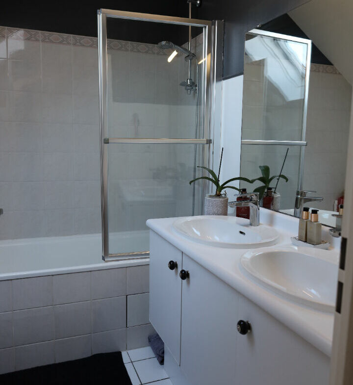 A l’étage : 3 chambres dont une avec salle de bain, wc et salle de bain séparés.