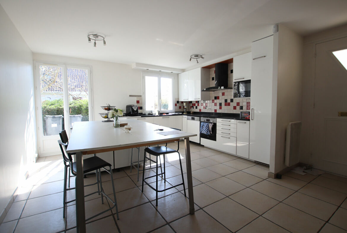 Maison de type Fontenay III avec extension de 8/9 pièces, 142 m² habitables , 160 m² utiles, terrain 511 m², entrée, salon triple avec cheminée insert, cuisine ouverte et équipée, chambre, salle de bains, wc, cellier/buanderie et garage.