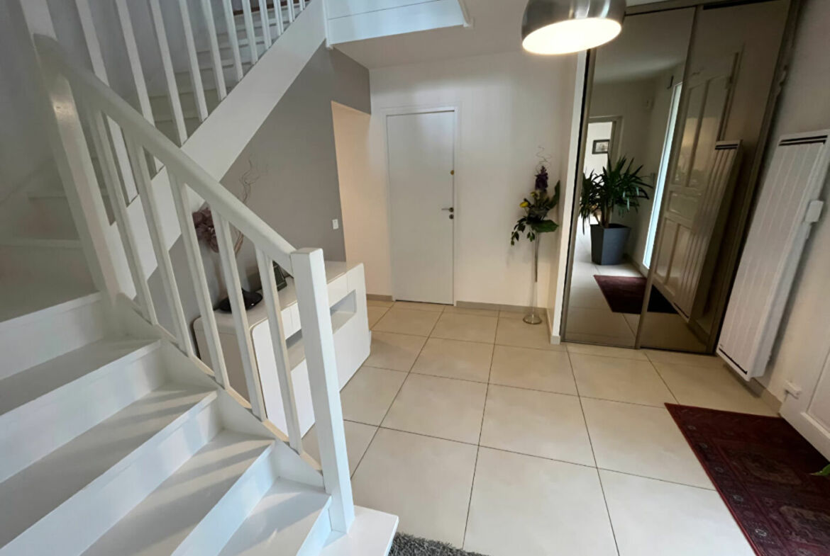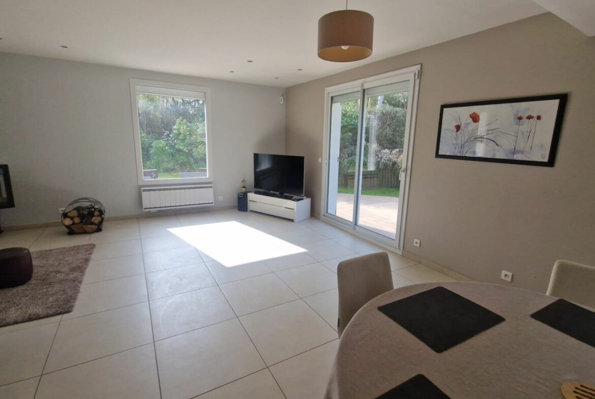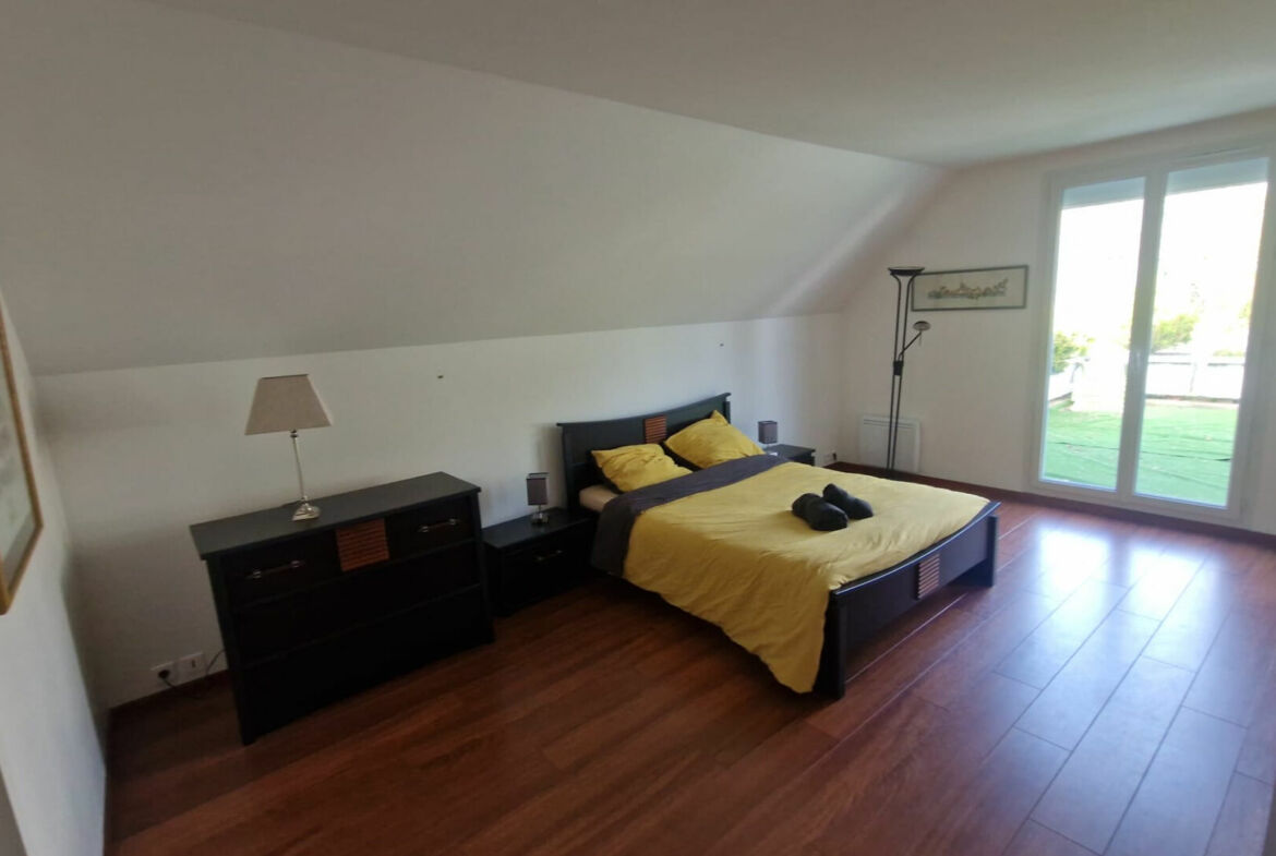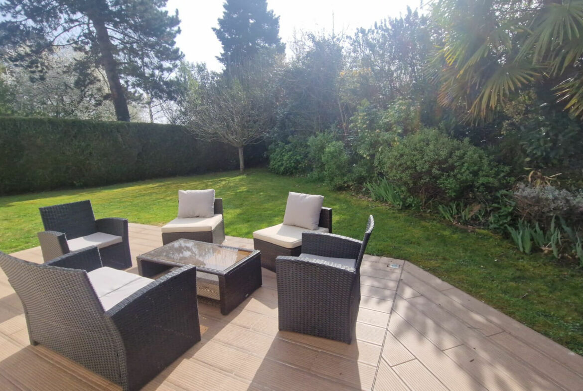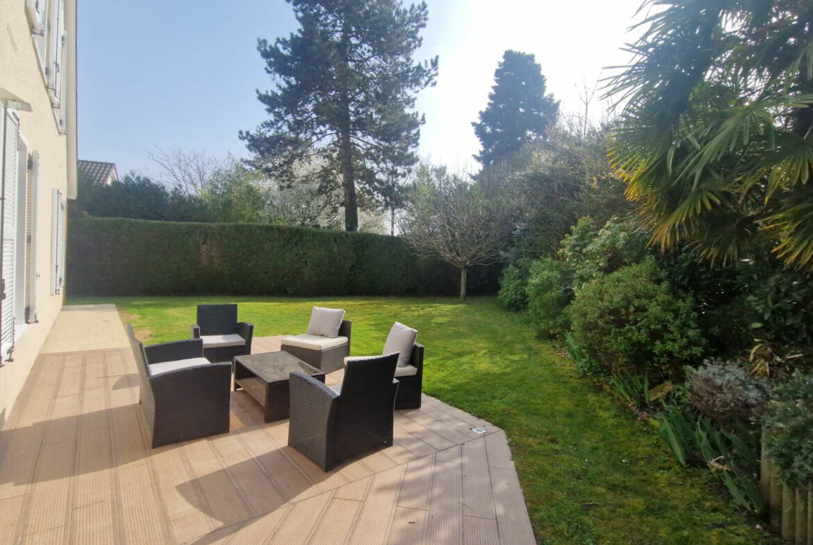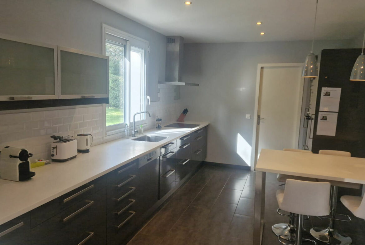 Maison de type Rambouillet II en bon état général, 216 m² habitables, terrain 886 m², hall d’entrée, wc avec lavabo, séjour double avec poêle (Sud-Ouest), salle à manger, cuisine équipée, bureau, chambre avec salle de bain, buanderie, cave à vins et garage double.