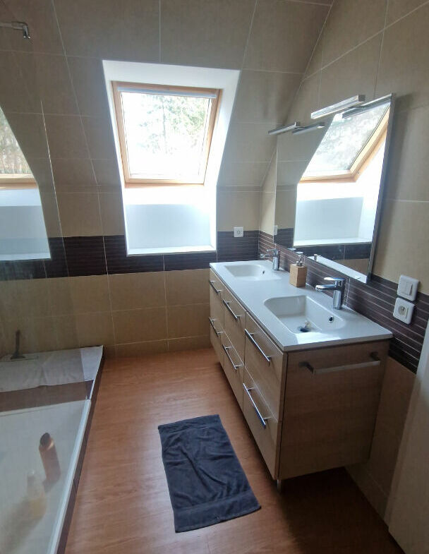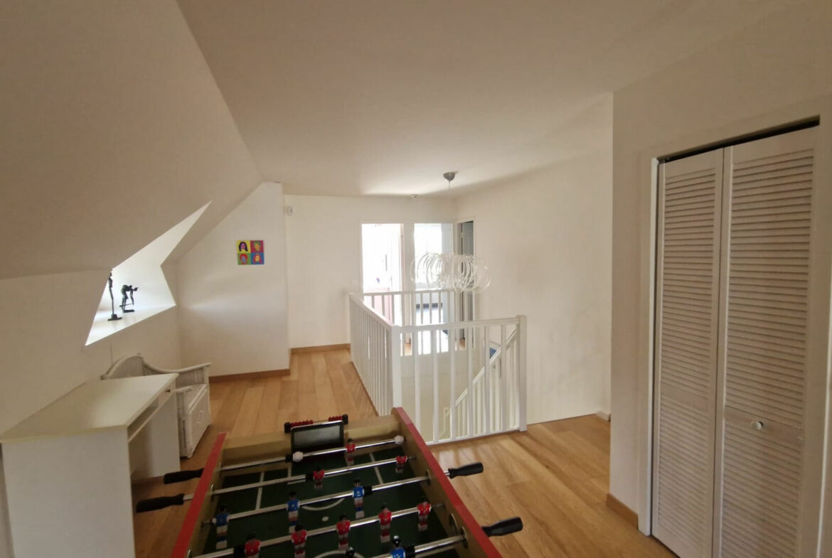 A l’étage : grand palier, trois chambres (possible 4) dont une avec salle d’eau/wc/dressing, terrasse, salle d’eau avec wc.