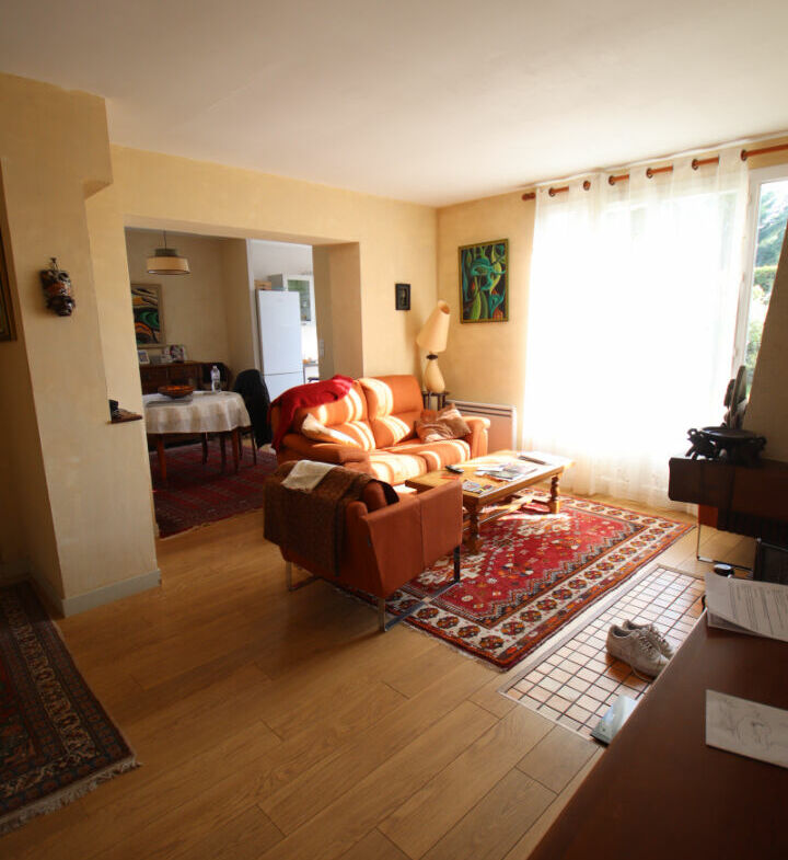 Maison de type Fontenay III, 6 pièces, 110 m² habitables, terrain 586 m², comprenant entrée, salon avec cheminée, cuisine équipée avec coin repas, trois chambres, salle d’eau, bureau, wc, buanderie et garage.