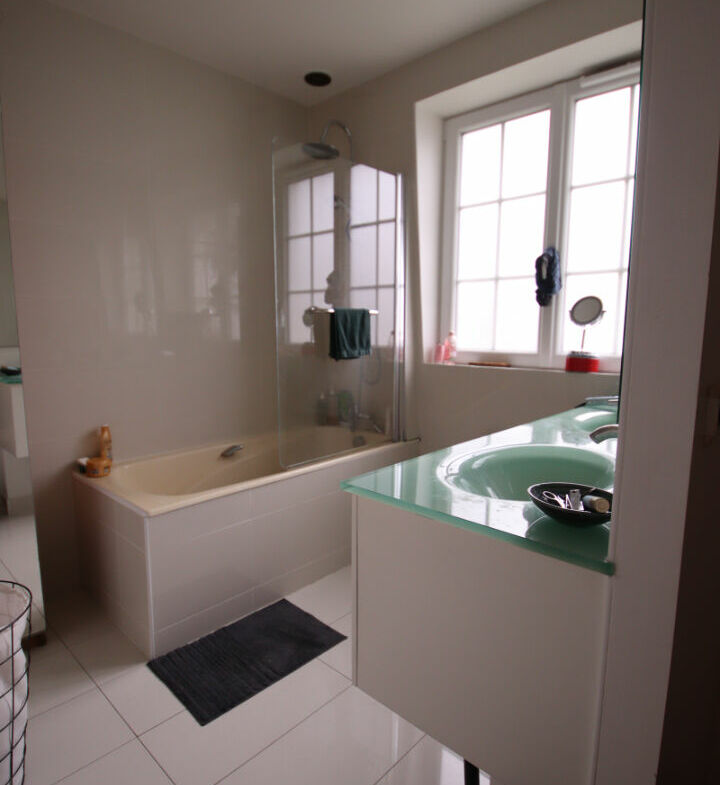 A l’étage : trois chambres dont une avec salle de bains, wc et dressing, salle d’eau séparés avec wc.