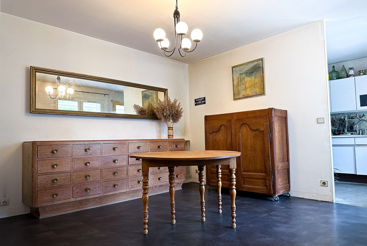 Cette maison comprend au rez-de-chaussée : une entrée donnant directement sur le séjour avec cheminée, un coin repas, une cuisine, un wc, une buanderie/garage.